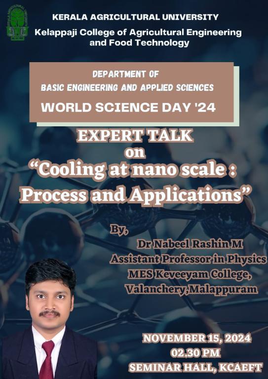 World Science Day celebrations were organized by the Dept.of BE & AS, KCAEFT, Tavanur. The Dean of faculty gave message to the gathering and HOD's of various departments expressed their felicitations on the occasion. A talk on the topic "Cooling at Nano scale: Process and Applications"  by Dr. Nabeel Rashin M, Assistant Professor in Physics, MES Keveeyam College Valancherry was the highlight of the day. Faculty and students of the KCAEFT  participated and made the event a grand success.